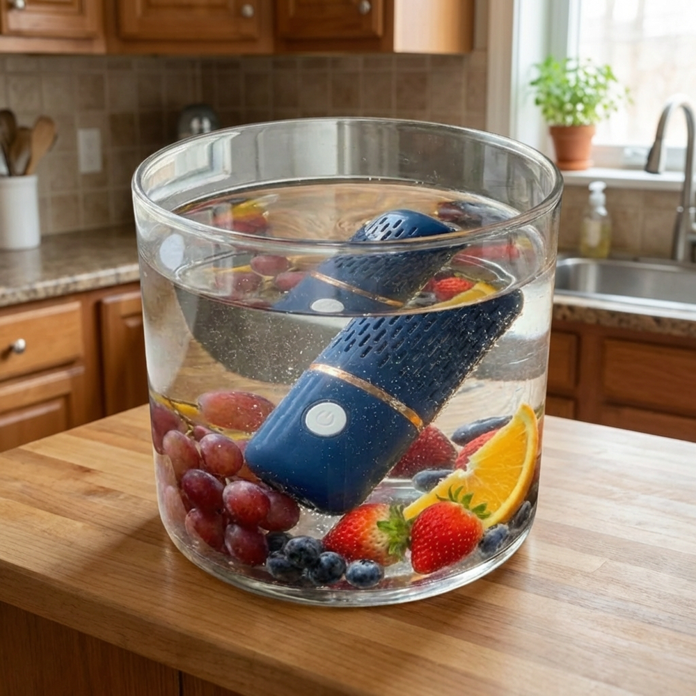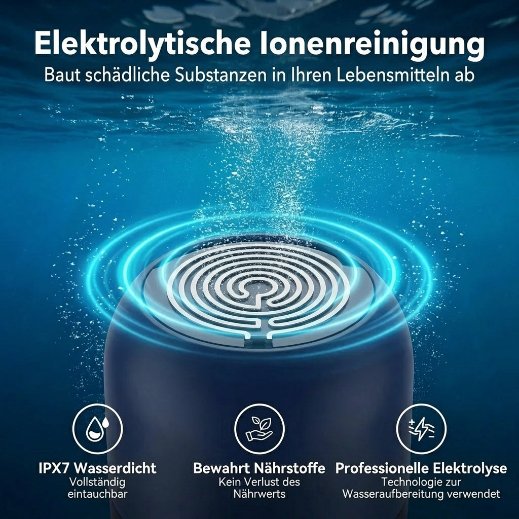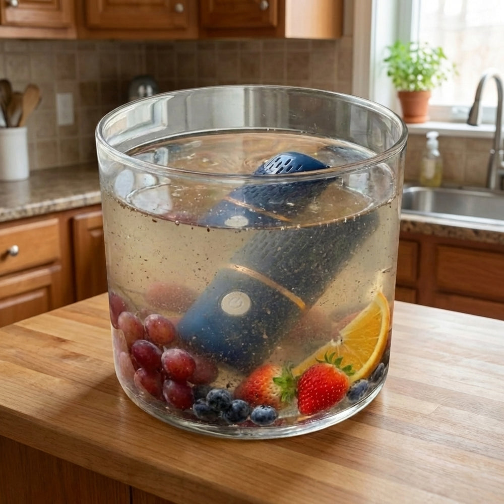 FreshBar nutzt Elektrolyse, um aktiviertes Wasser zu erzeugen. Dabei entstehen Hydroxylradikale und Hypochlorsäure, die Pestizide und Bakterien auf molekularer Ebene abbauen. Einfach in eine Schüssel mit Leitungswasser legen, Knopf drücken und 10 Minuten warten.
