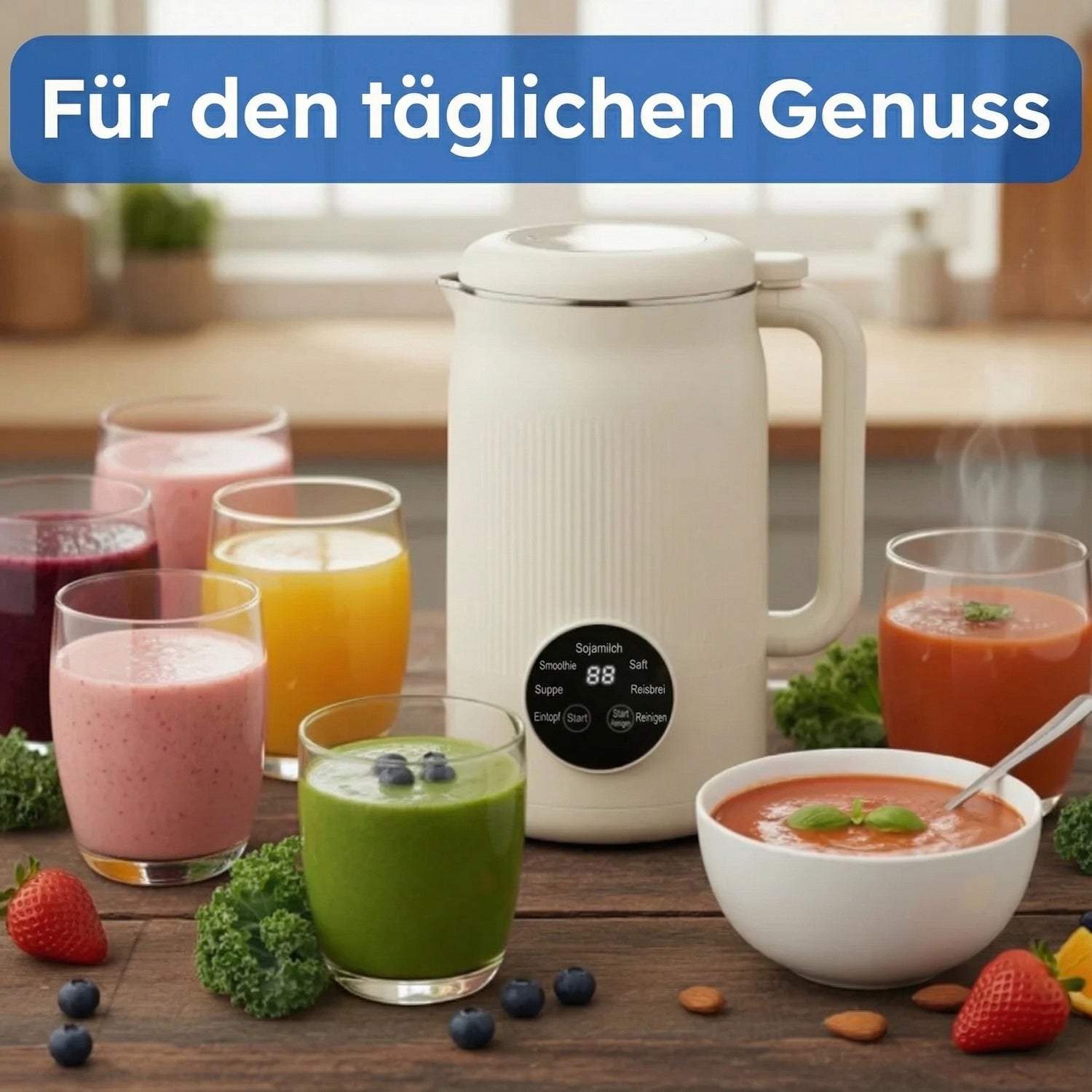 Pflanzenmilch aller Art (Mandel, Soja, Hafer, Haselnuss etc.), Smoothies, heiße Suppen, Saucen und viele weitere frische Rezepte.